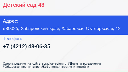 Детский сад №48 по адресу 680025, Хабаровский край, Хабаровск, Октябрьская, 12 в дальнейшем Организация, размещена в следующих категориях: