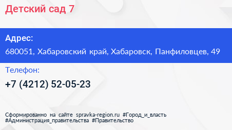 Детский сад №7 по адресу 680051, Хабаровский край, Хабаровск, Панфиловцев, 49 в дальнейшем Организация, размещена в следующих категориях: