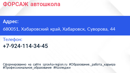 ФОРСАЖ, автошкола по адресу 680051, Хабаровский край, Хабаровск, Суворова, 44 в дальнейшем Организация, размещена в следующих категориях: