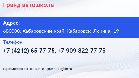 Гранд, автошкола по адресу 680000, Хабаровский край, Хабаровск, Ленина, 19 в дальнейшем Организация, размещена в следующих категориях: