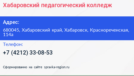 Хабаровский педагогический колледж по адресу 680045, Хабаровский край, Хабаровск, Краснореченская, 114а в дальнейшем Организация, размещена в следующих категориях: