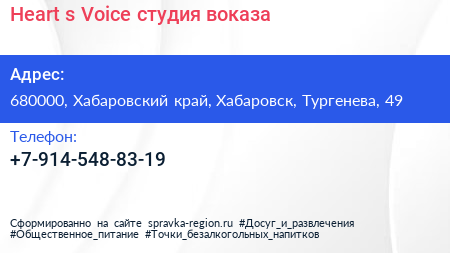 Heart`s Voice, студия воказа по адресу 680000, Хабаровский край, Хабаровск, Тургенева, 49 в дальнейшем Организация, размещена в следующих категориях: