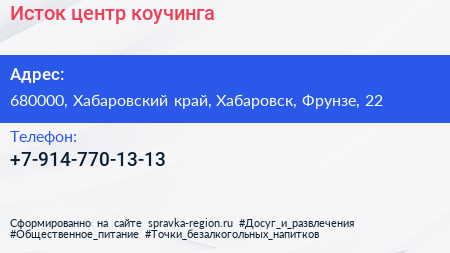 Исток, центр коучинга по адресу 680000, Хабаровский край, Хабаровск, Фрунзе, 22 в дальнейшем Организация, размещена в следующих категориях: