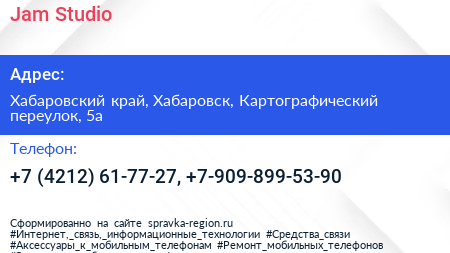 Jam Studio по адресу Хабаровский край, Хабаровск, Картографический переулок, 5а в дальнейшем Организация, размещена в следующих категориях: