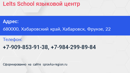 Lelts School, языковой центр по адресу 680000, Хабаровский край, Хабаровск, Фрунзе, 22 в дальнейшем Организация, размещена в следующих категориях: