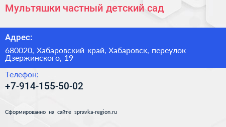 Мультяшки, частный детский сад по адресу 680020, Хабаровский край, Хабаровск, переулок Дзержинского, 19 в дальнейшем Организация, размещена в следующих категориях: