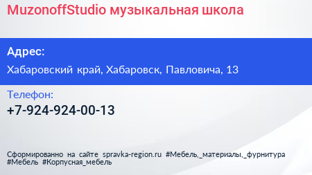 MuzonoffStudio, музыкальная школа по адресу Хабаровский край, Хабаровск, Павловича, 13 в дальнейшем Организация, размещена в следующих категориях: