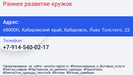 Раннее развитие, кружок по адресу 680000, Хабаровский край, Хабаровск, Льва Толстого, 22 в дальнейшем Организация, размещена в следующих категориях: