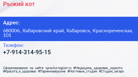 Рыжий кот по адресу 680006, Хабаровский край, Хабаровск, Краснореченская, 101 в дальнейшем Организация, размещена в следующих категориях: