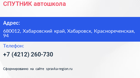 СПУТНИК, автошкола по адресу 680012, Хабаровский край, Хабаровск, Краснореченская, 94 в дальнейшем Организация, размещена в следующих категориях: