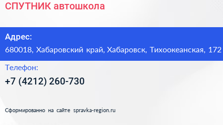 СПУТНИК, автошкола по адресу 680018, Хабаровский край, Хабаровск, Тихоокеанская, 172 в дальнейшем Организация, размещена в следующих категориях: