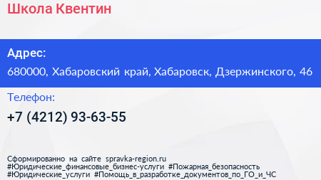 Школа Квентин по адресу 680000, Хабаровский край, Хабаровск, Дзержинского, 46 в дальнейшем Организация, размещена в следующих категориях: