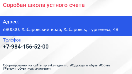 Соробан, школа устного счета по адресу 680000, Хабаровский край, Хабаровск, Тургенева, 48 в дальнейшем Организация, размещена в следующих категориях: