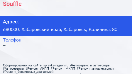 Souffle по адресу 680000, Хабаровский край, Хабаровск, Калинина, 80 в дальнейшем Организация, размещена в следующих категориях: