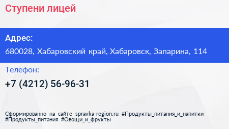 Ступени, лицей по адресу 680028, Хабаровский край, Хабаровск, Запарина, 114 в дальнейшем Организация, размещена в следующих категориях: