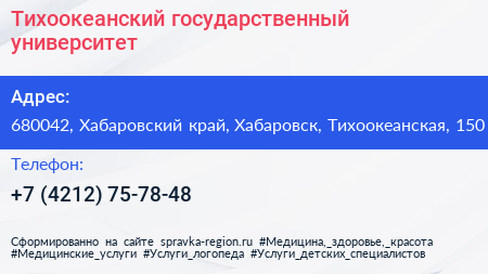 Тихоокеанский государственный университет по адресу 680042, Хабаровский край, Хабаровск, Тихоокеанская, 150 в дальнейшем Организация, размещена в следующих категориях: