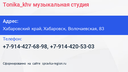 Tonika_khv, музыкальная студия по адресу Хабаровский край, Хабаровск, Волочаевская, 83 в дальнейшем Организация, размещена в следующих категориях: