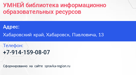УМНЕЙ, библиотека информационно-образовательных ресурсов по адресу Хабаровский край, Хабаровск, Павловича, 13 в дальнейшем Организация, размещена в следующих категориях: