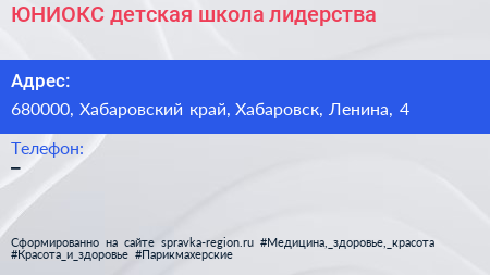 ЮНИОКС, детская школа лидерства по адресу 680000, Хабаровский край, Хабаровск, Ленина, 4 в дальнейшем Организация, размещена в следующих категориях: