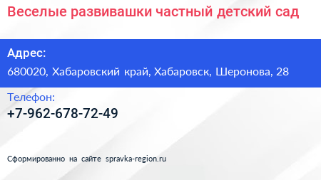 Веселые развивашки, частный детский сад по адресу 680020, Хабаровский край, Хабаровск, Шеронова, 28 в дальнейшем Организация, размещена в следующих категориях: