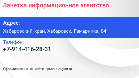 Зачетка, информационное агентство по адресу Хабаровский край, Хабаровск, Гамарника, 84 в дальнейшем Организация, размещена в следующих категориях:
