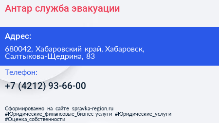 Антар, служба эвакуации по адресу 680042, Хабаровский край, Хабаровск, Салтыкова-Щедрина, 83 в дальнейшем Организация, размещена в следующих категориях: