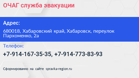 ОЧАГ, служба эвакуации по адресу 680018, Хабаровский край, Хабаровск, переулок Пархоменко, 2а в дальнейшем Организация, размещена в следующих категориях: