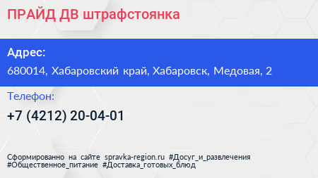 ПРАЙД-ДВ, штрафстоянка по адресу 680014, Хабаровский край, Хабаровск, Медовая, 2 в дальнейшем Организация, размещена в следующих категориях: