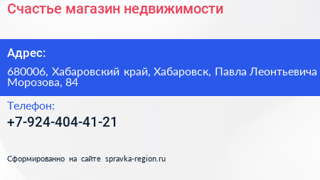 Счастье, магазин недвижимости по адресу 680006, Хабаровский край, Хабаровск, Павла Леонтьевича Морозова, 84 в дальнейшем Организация, размещена в следующих категориях: