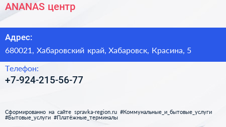 ANANAS, центр по адресу 680021, Хабаровский край, Хабаровск, Красина, 5 в дальнейшем Организация, размещена в следующих категориях: