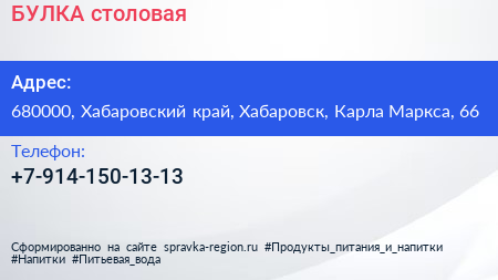 БУЛКА, столовая по адресу 680000, Хабаровский край, Хабаровск, Карла Маркса, 66 в дальнейшем Организация, размещена в следующих категориях: