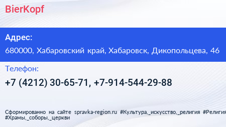 BierKopf по адресу 680000, Хабаровский край, Хабаровск, Дикопольцева, 46 в дальнейшем Организация, размещена в следующих категориях: