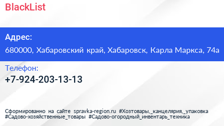 BlackList по адресу 680000, Хабаровский край, Хабаровск, Карла Маркса, 74а в дальнейшем Организация, размещена в следующих категориях: