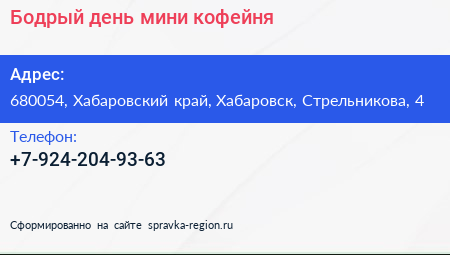 Бодрый день, мини-кофейня по адресу 680054, Хабаровский край, Хабаровск, Стрельникова, 4 в дальнейшем Организация, размещена в следующих категориях: