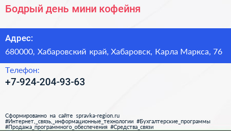 Бодрый день, мини-кофейня по адресу 680000, Хабаровский край, Хабаровск, Карла Маркса, 76 в дальнейшем Организация, размещена в следующих категориях: