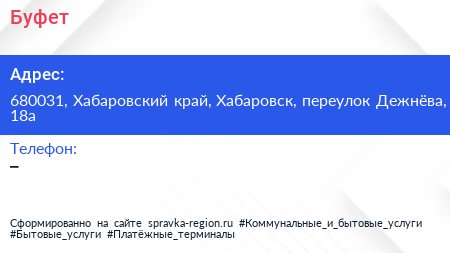 Буфет по адресу 680031, Хабаровский край, Хабаровск, переулок Дежнёва, 18а в дальнейшем Организация, размещена в следующих категориях: