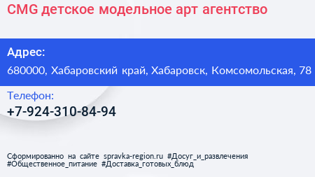 CMG, детское модельное арт-агентство по адресу 680000, Хабаровский край, Хабаровск, Комсомольская, 78 в дальнейшем Организация, размещена в следующих категориях: