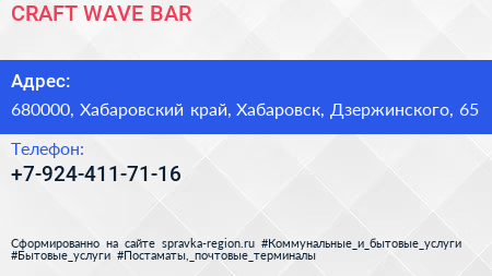 CRAFT WAVE BAR по адресу 680000, Хабаровский край, Хабаровск, Дзержинского, 65 в дальнейшем Организация, размещена в следующих категориях: