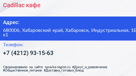 Cadillac, кафе по адресу 680006, Хабаровский край, Хабаровск, Индустриальная, 1Б к1 в дальнейшем Организация, размещена в следующих категориях: