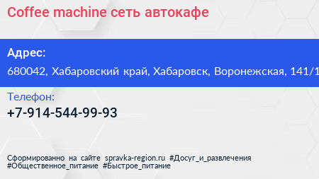Coffee machine, сеть автокафе по адресу 680042, Хабаровский край, Хабаровск, Воронежская, 141/1 в дальнейшем Организация, размещена в следующих категориях: