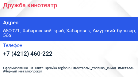 Дружба, кинотеатр по адресу 680021, Хабаровский край, Хабаровск, Амурский бульвар, 56а в дальнейшем Организация, размещена в следующих категориях: