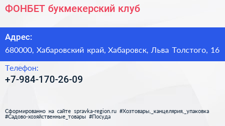ФОНБЕТ, букмекерский клуб по адресу 680000, Хабаровский край, Хабаровск, Льва Толстого, 16 в дальнейшем Организация, размещена в следующих категориях: