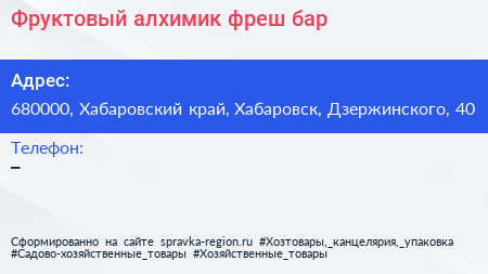 Фруктовый алхимик, фреш-бар по адресу 680000, Хабаровский край, Хабаровск, Дзержинского, 40 в дальнейшем Организация, размещена в следующих категориях: