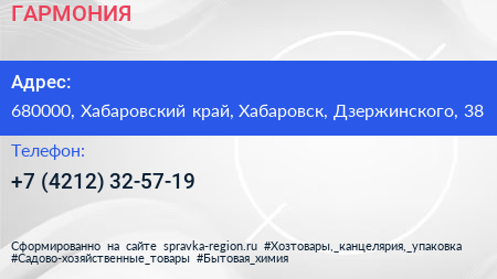ГАРМОНИЯ по адресу 680000, Хабаровский край, Хабаровск, Дзержинского, 38 в дальнейшем Организация, размещена в следующих категориях: