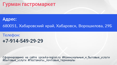 Гурман, гастромаркет по адресу 680051, Хабаровский край, Хабаровск, Ворошилова, 29Б в дальнейшем Организация, размещена в следующих категориях: