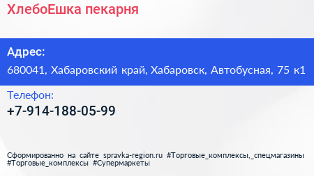 ХлебоЕшка, пекарня по адресу 680041, Хабаровский край, Хабаровск, Автобусная, 75 к1 в дальнейшем Организация, размещена в следующих категориях: