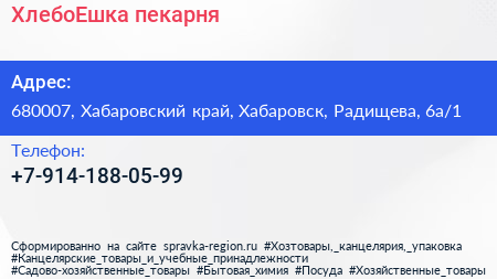 ХлебоЕшка, пекарня по адресу 680007, Хабаровский край, Хабаровск, Радищева, 6а/1 в дальнейшем Организация, размещена в следующих категориях: