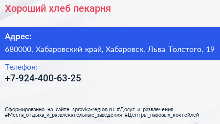 Хороший хлеб, пекарня по адресу 680000, Хабаровский край, Хабаровск, Льва Толстого, 19 в дальнейшем Организация, размещена в следующих категориях: