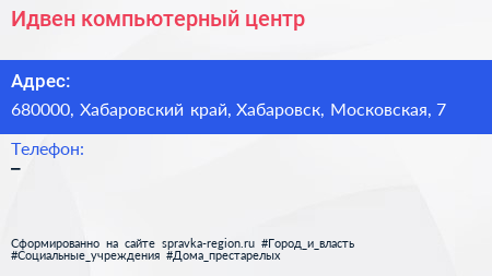 Идвен, компьютерный центр по адресу 680000, Хабаровский край, Хабаровск, Московская, 7 в дальнейшем Организация, размещена в следующих категориях: