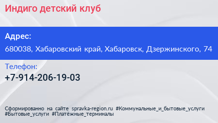 Индиго, детский клуб по адресу 680038, Хабаровский край, Хабаровск, Дзержинского, 74 в дальнейшем Организация, размещена в следующих категориях: